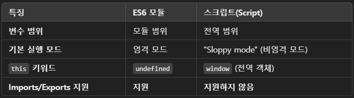 - ES6 모듈은 기본적으로 **엄격 모드(Strict mode)**에서 실행됩니다.